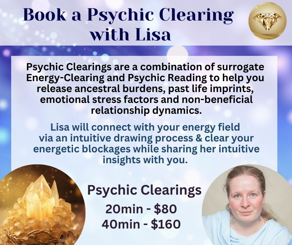 Pre-book a Psychic Clearing Session with Lisa at MBSF and pay $75 for 20min (instead of $80) or $150 for 40min (instead of $160). To pre-book, send Lisa an email or get in touch via Facebook or Instagram.